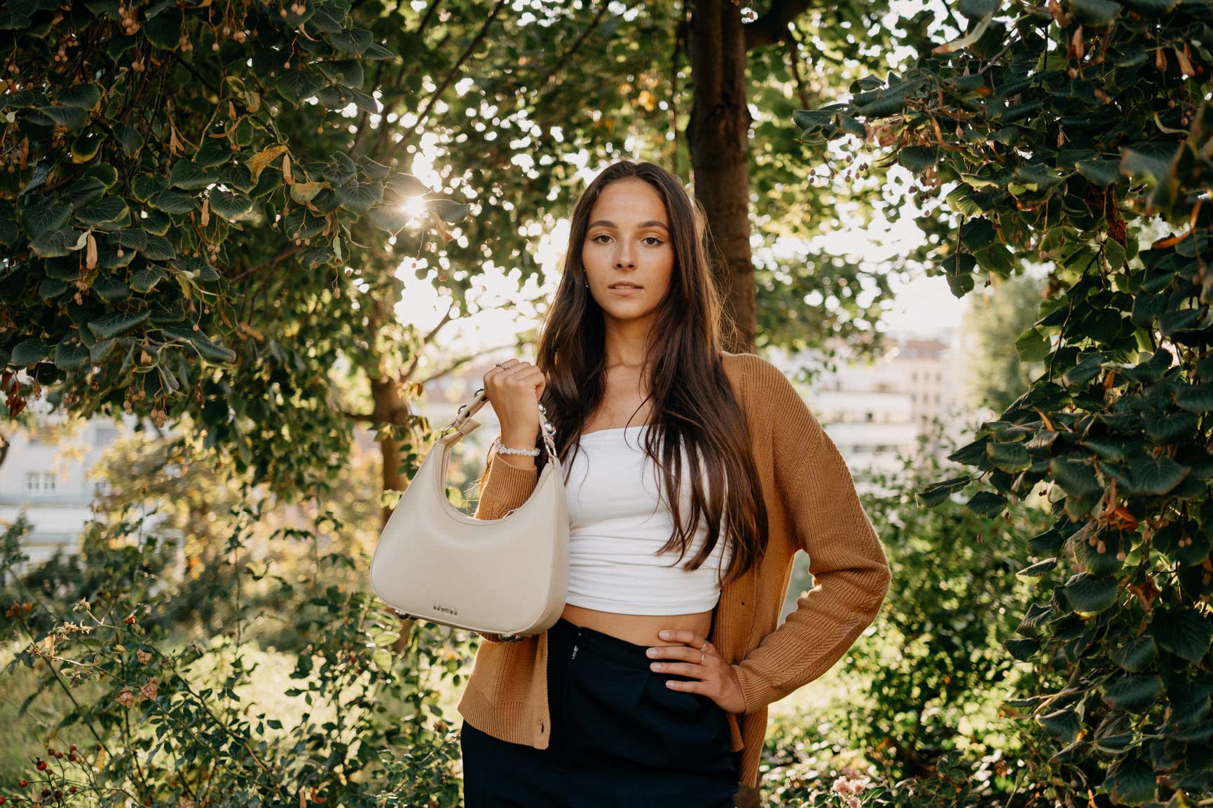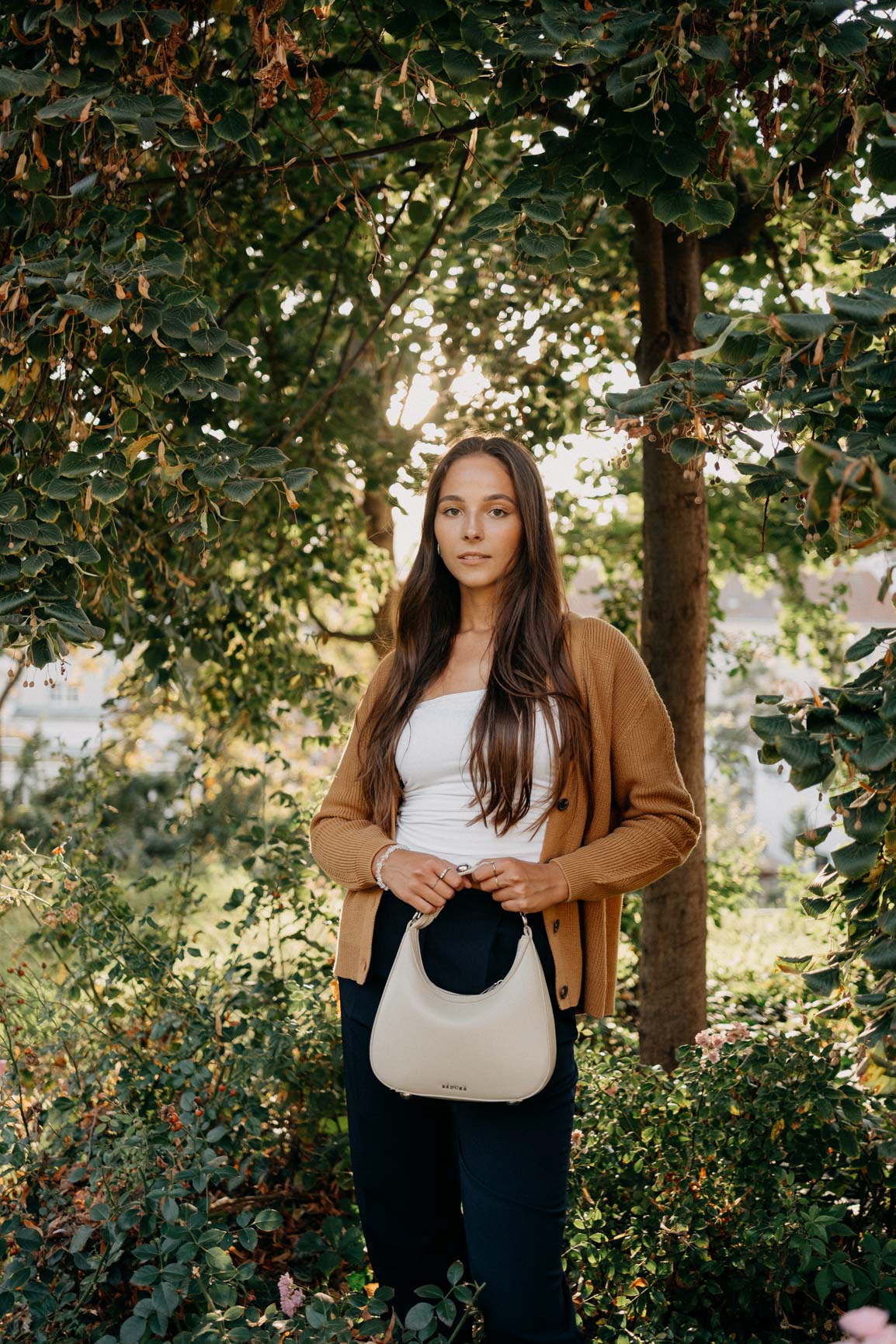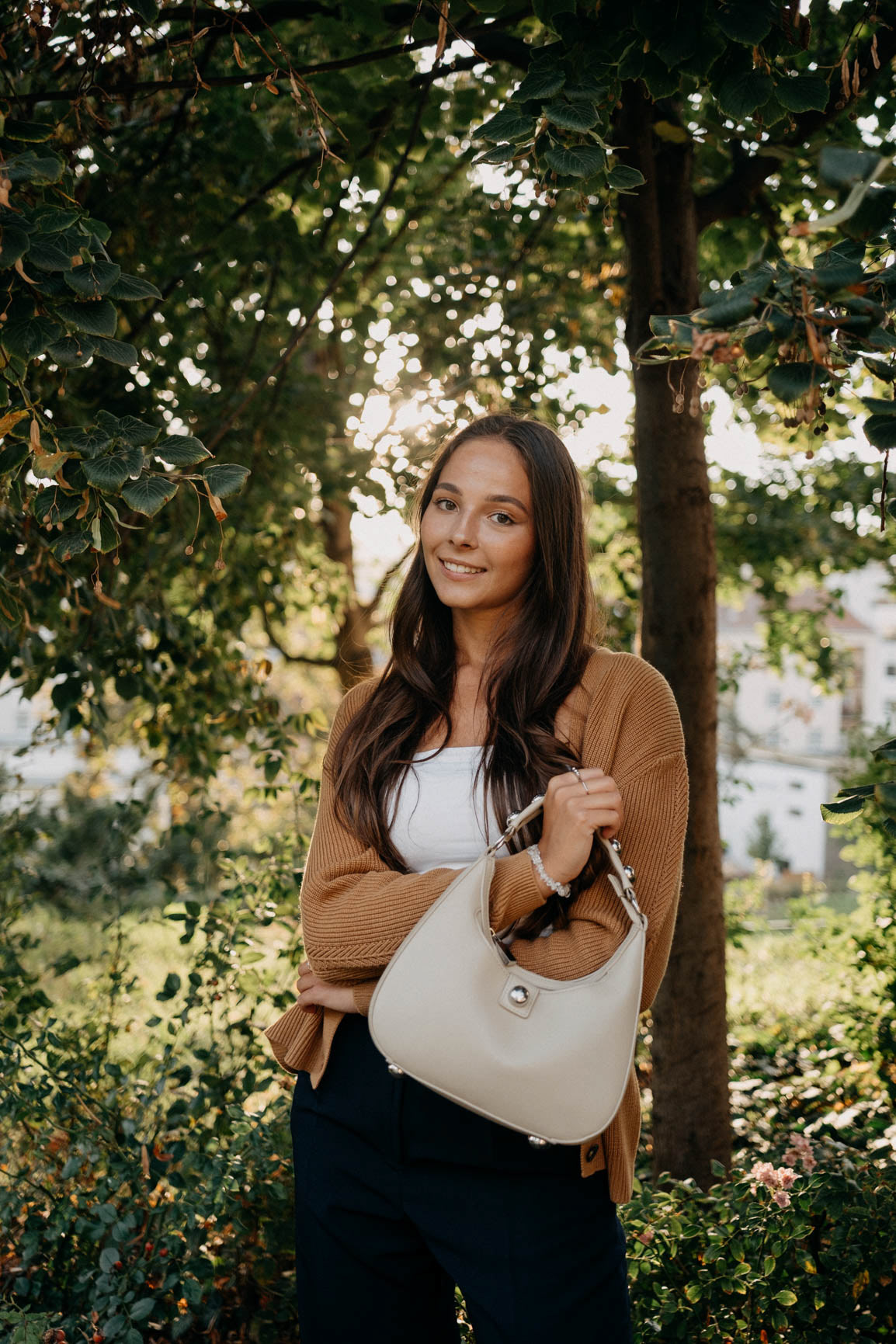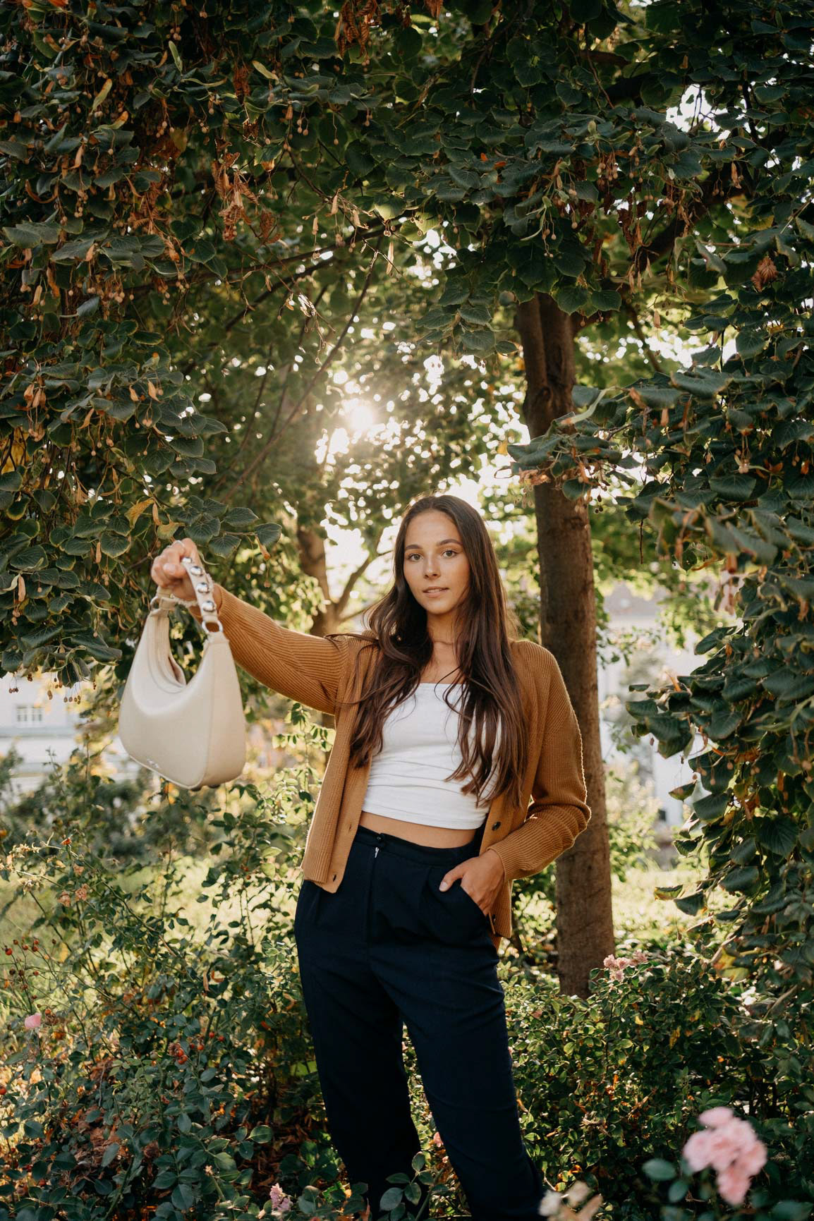 Ležérní outfit doplněný jemnou kabelkou, která dokonale ladí s celkovým stylem, a šperkem, jenž dodává výsledku ten správný šmrnc. 💍👜