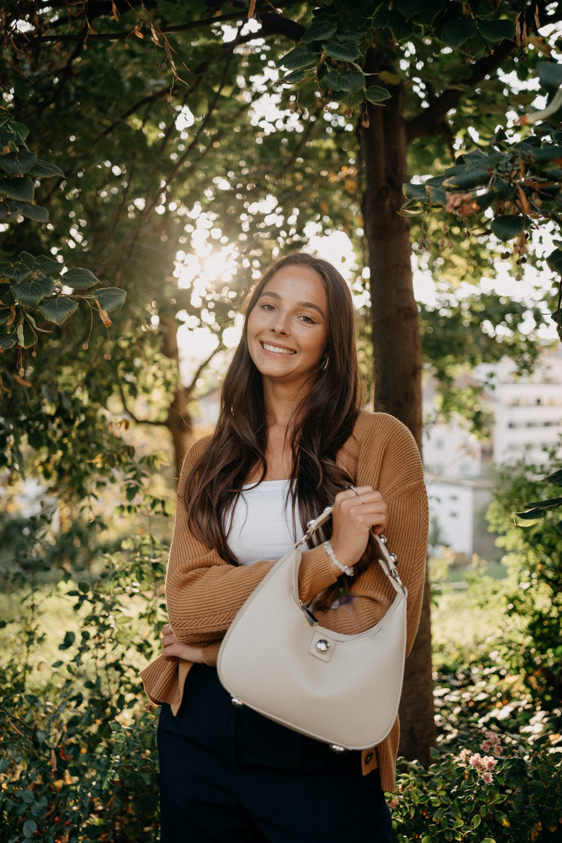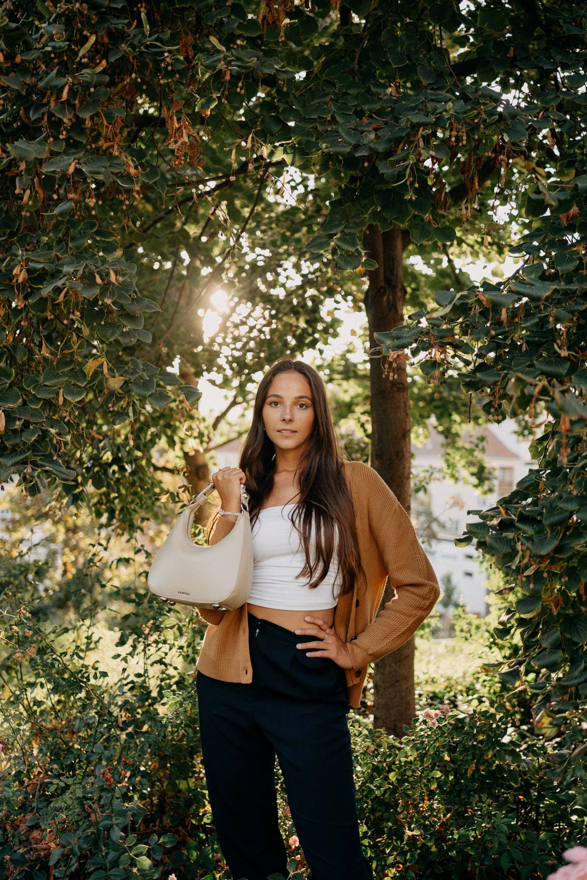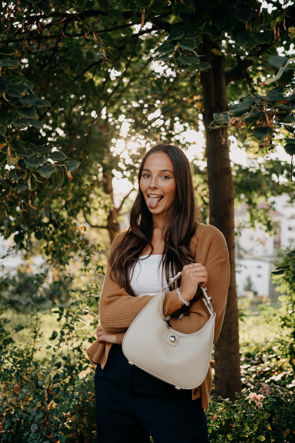 Ležérní outfit doplněný jemnou kabelkou, která dokonale ladí s celkovým stylem, a šperkem, jenž dodává výsledku ten správný šmrnc. 💍👜