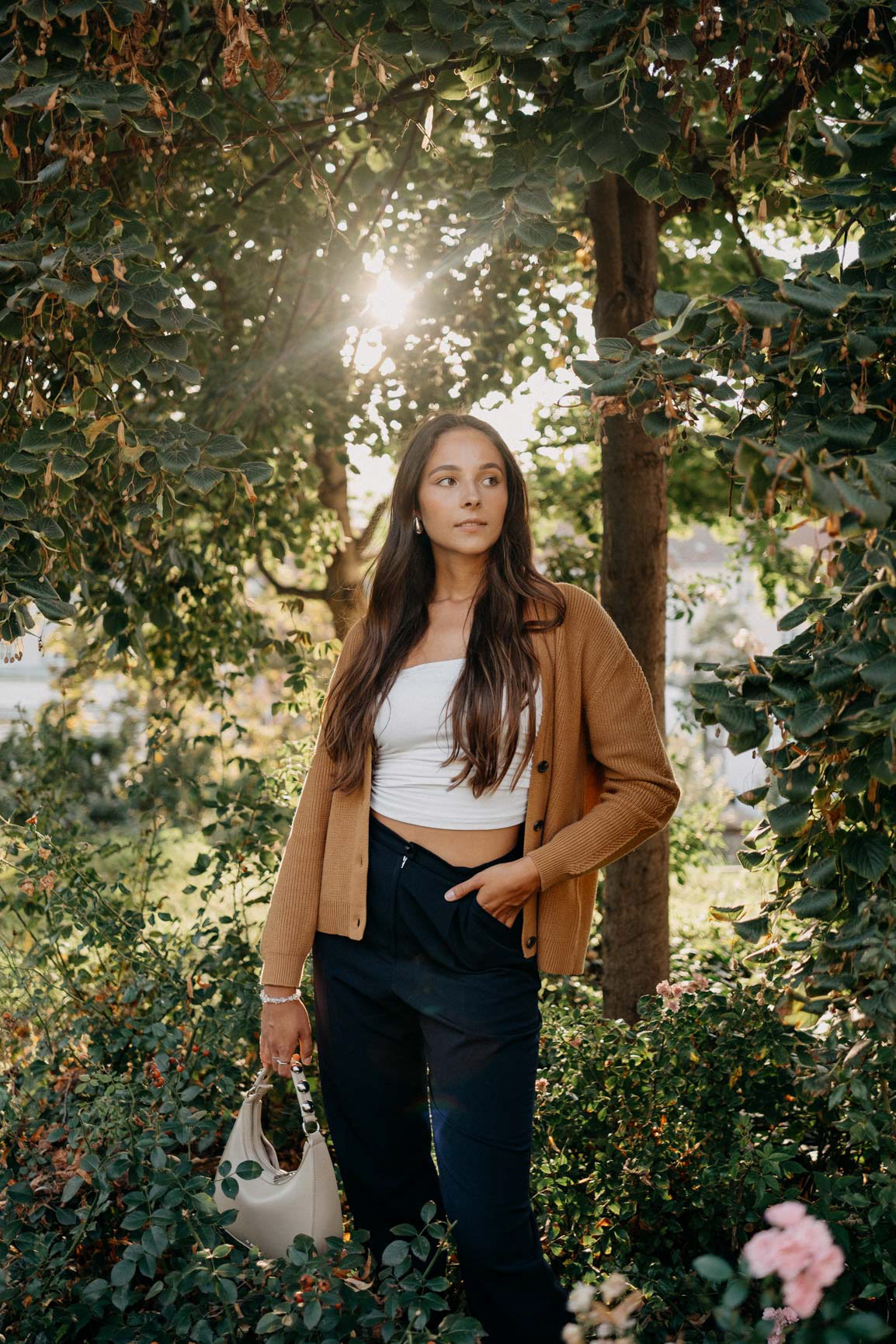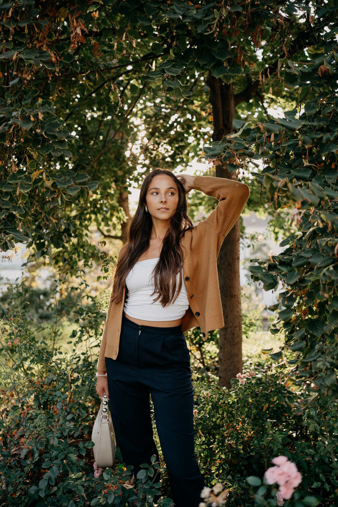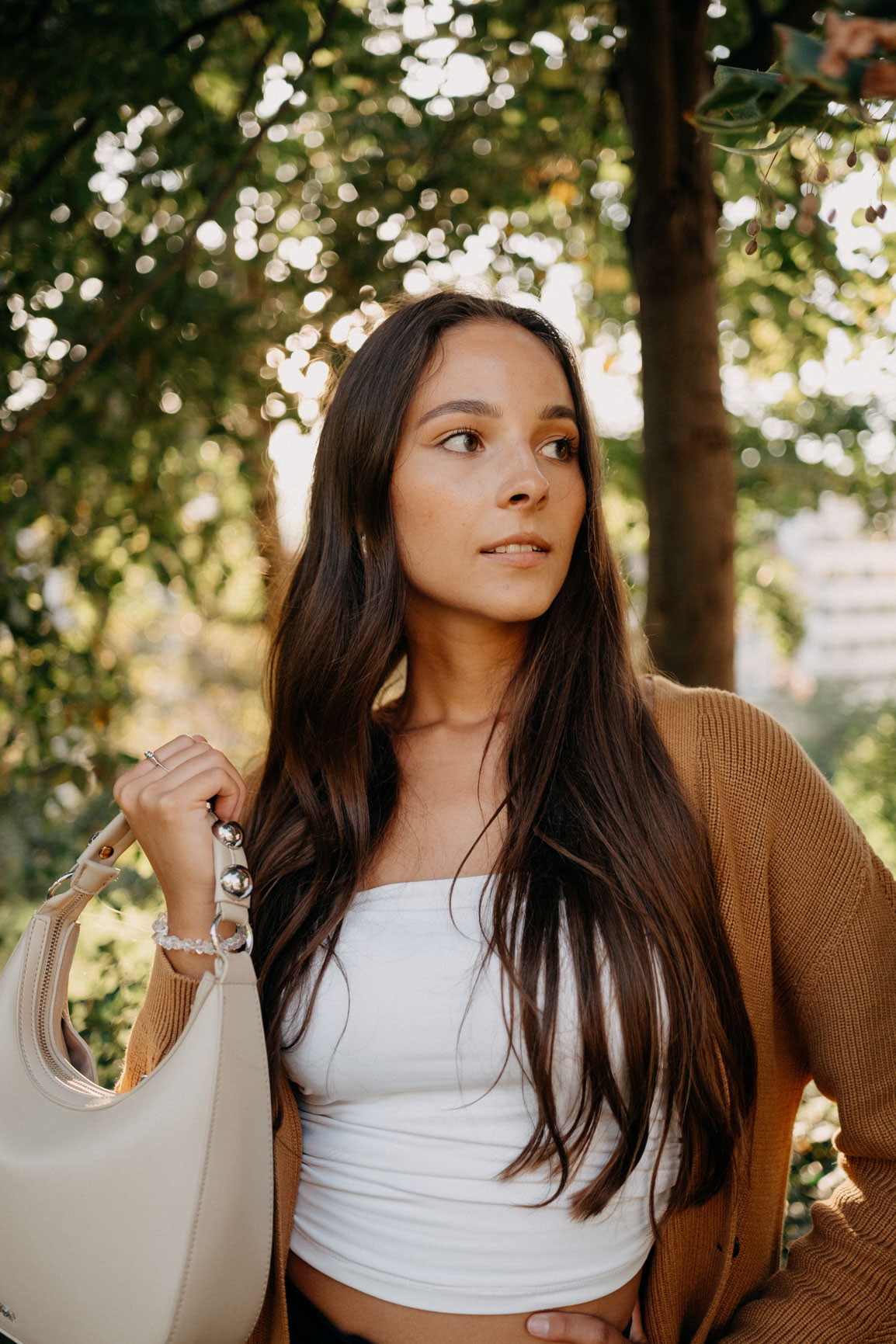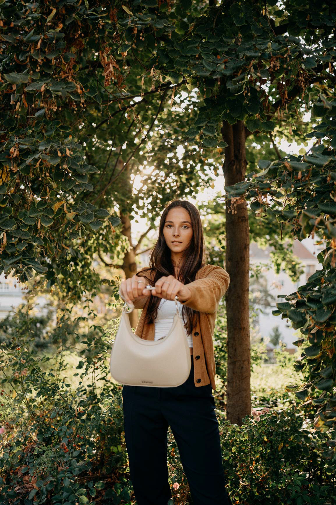 Ležérní outfit doplněný jemnou kabelkou, která dokonale ladí s celkovým stylem, a šperkem, jenž dodává výsledku ten správný šmrnc. 💍👜