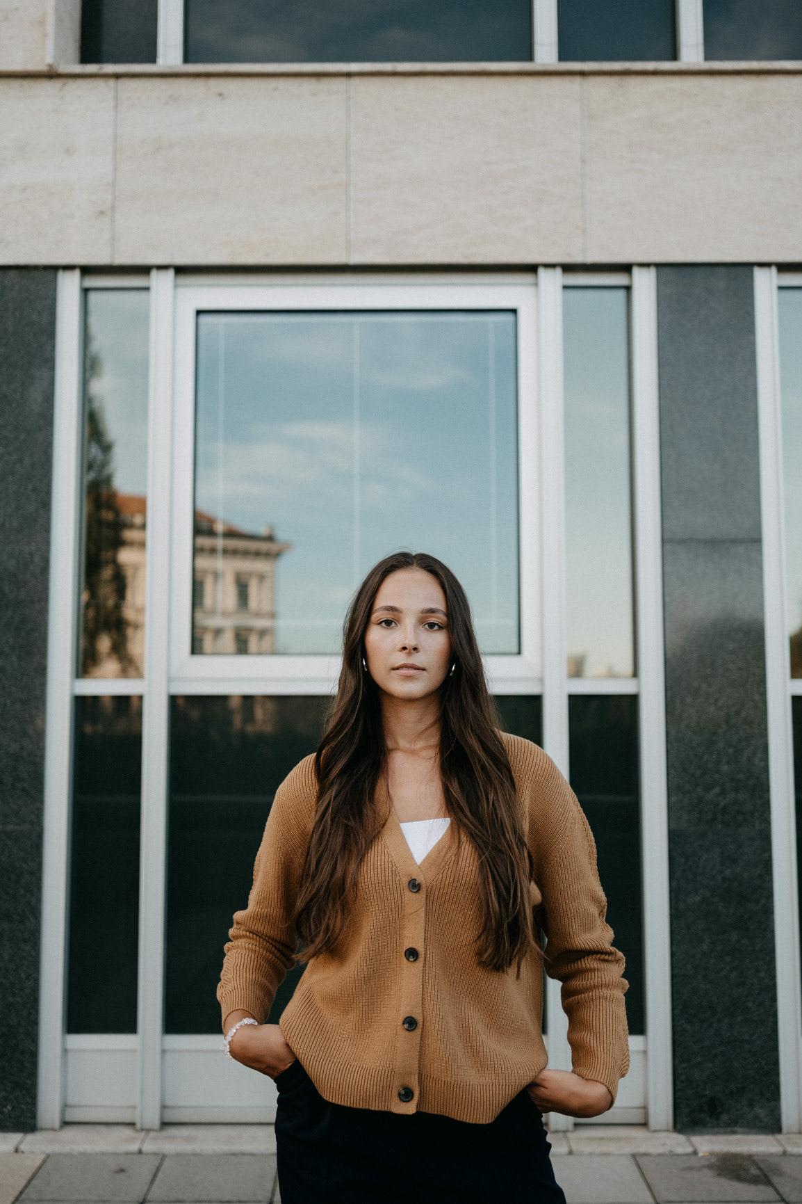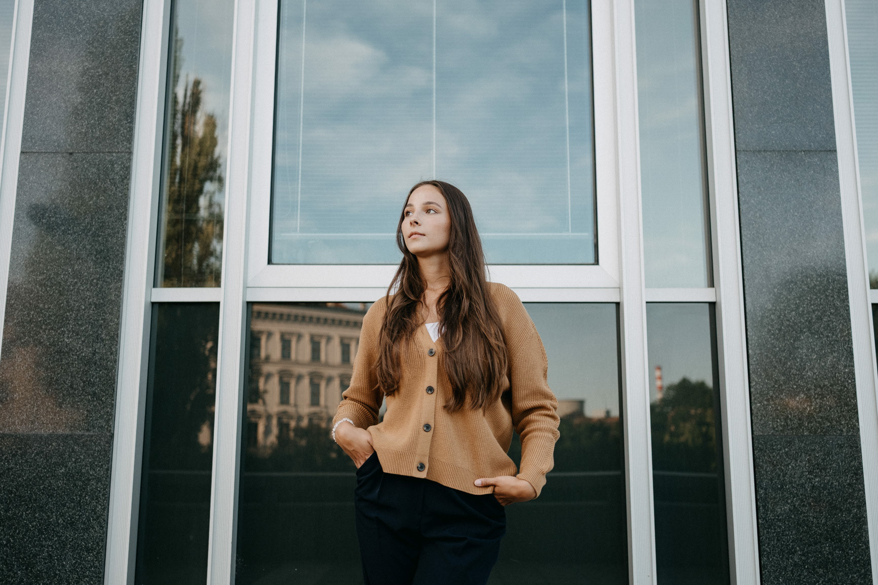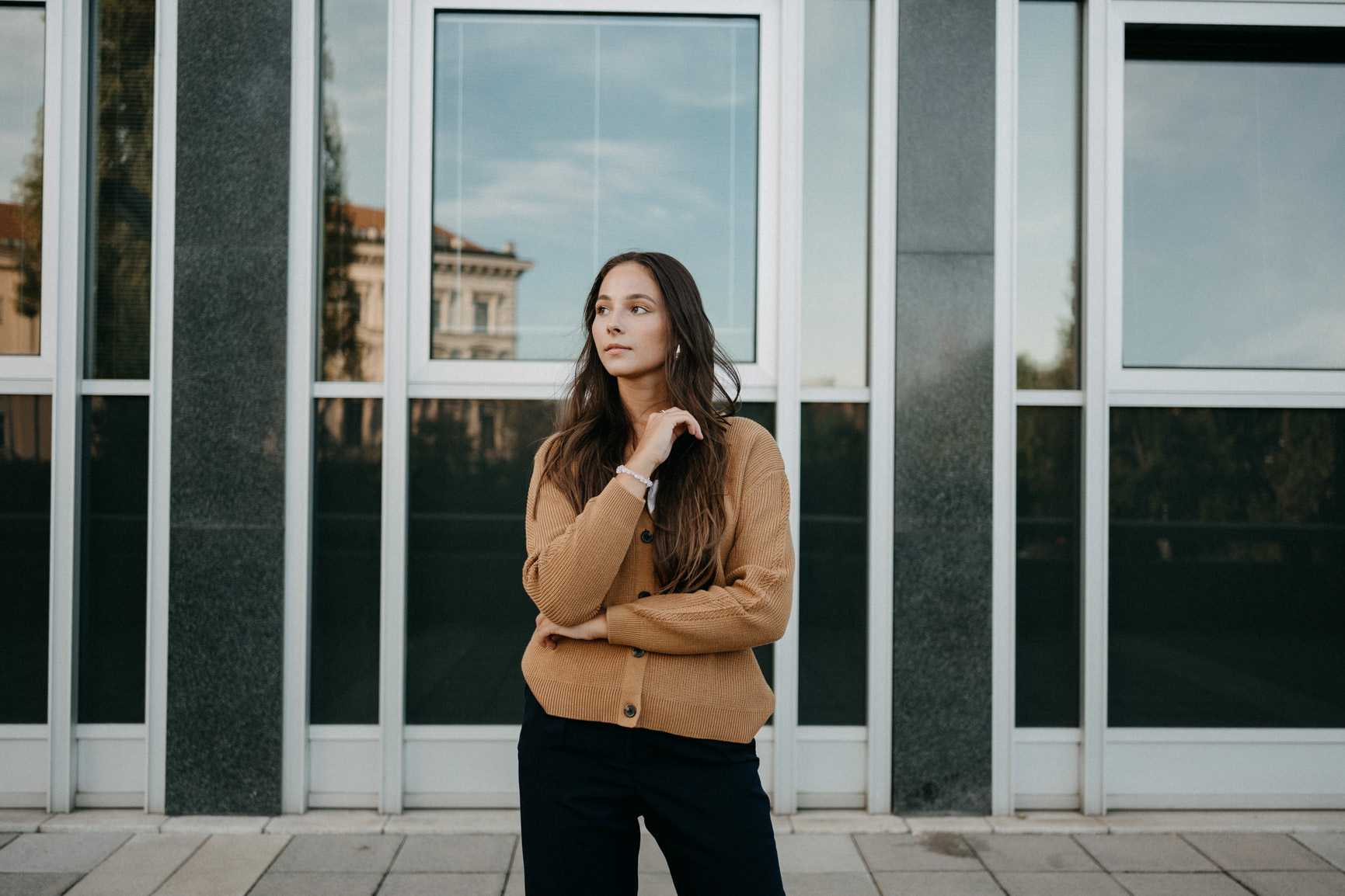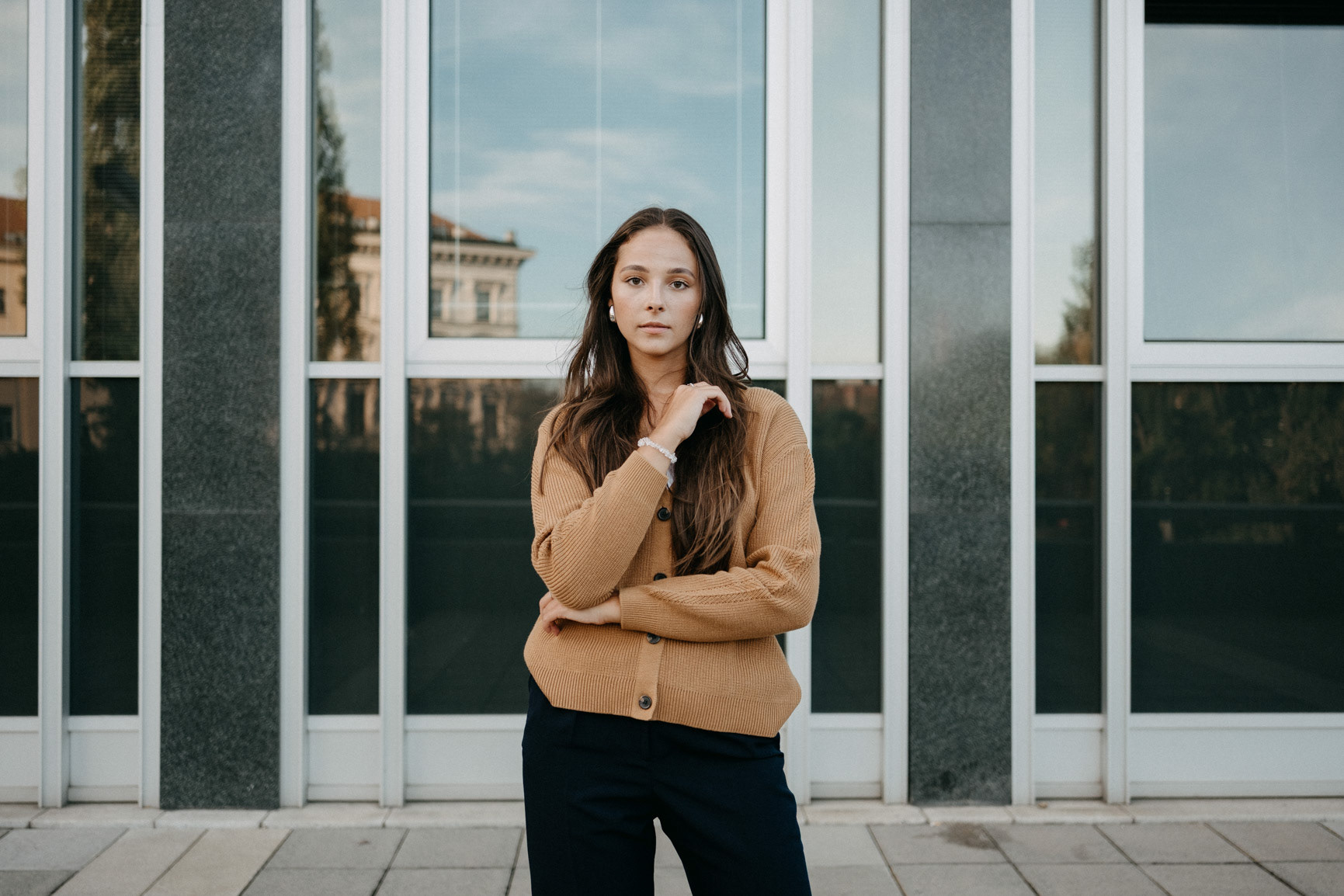 Teplý karamelový svetr, studené sklo za zády, jemný náramek, který zachytí světlo. Kontrast města a klidu. To všechno dohromady vytváří něco, co je pro mě podzim – rovnováha mezi energií a zastavením. 🍂