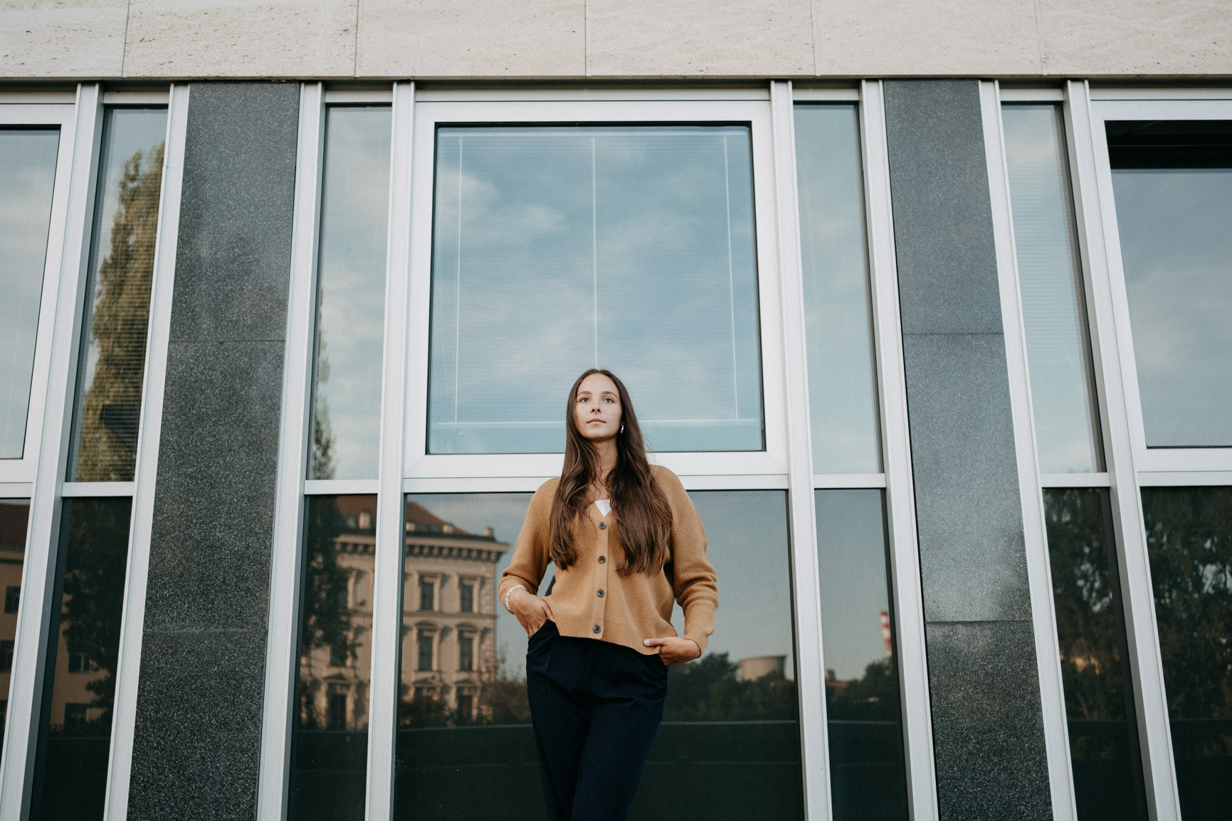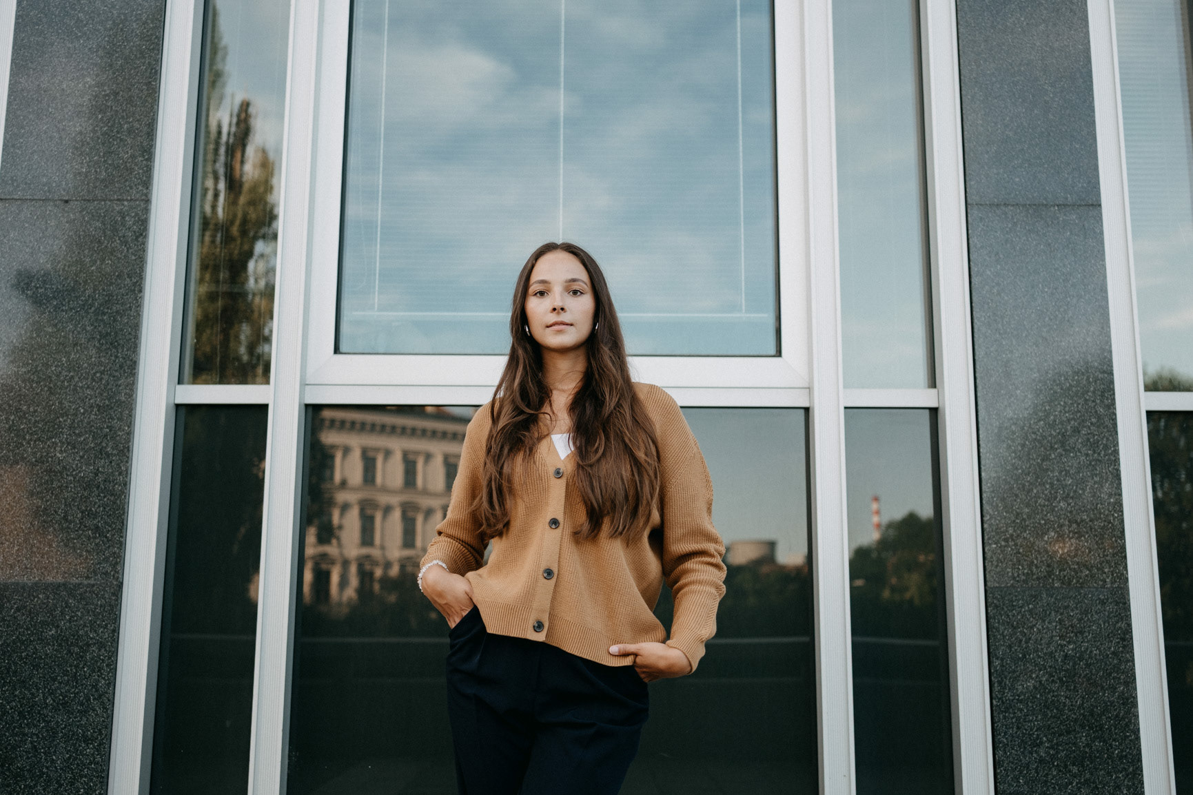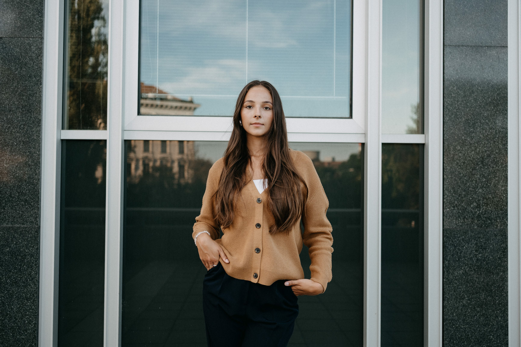 Teplý karamelový svetr, studené sklo za zády, jemný náramek, který zachytí světlo. Kontrast města a klidu. To všechno dohromady vytváří něco, co je pro mě podzim – rovnováha mezi energií a zastavením. 🍂