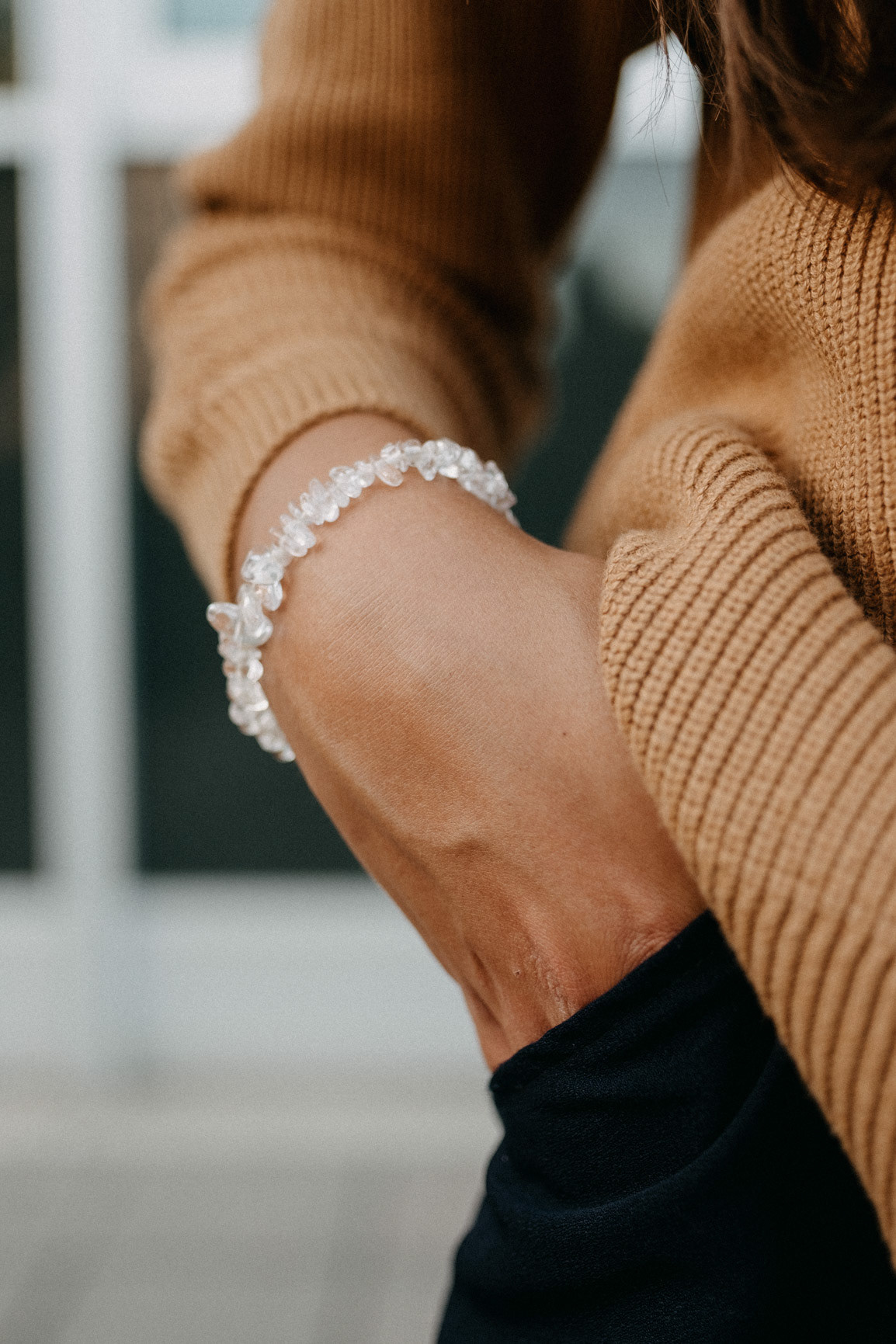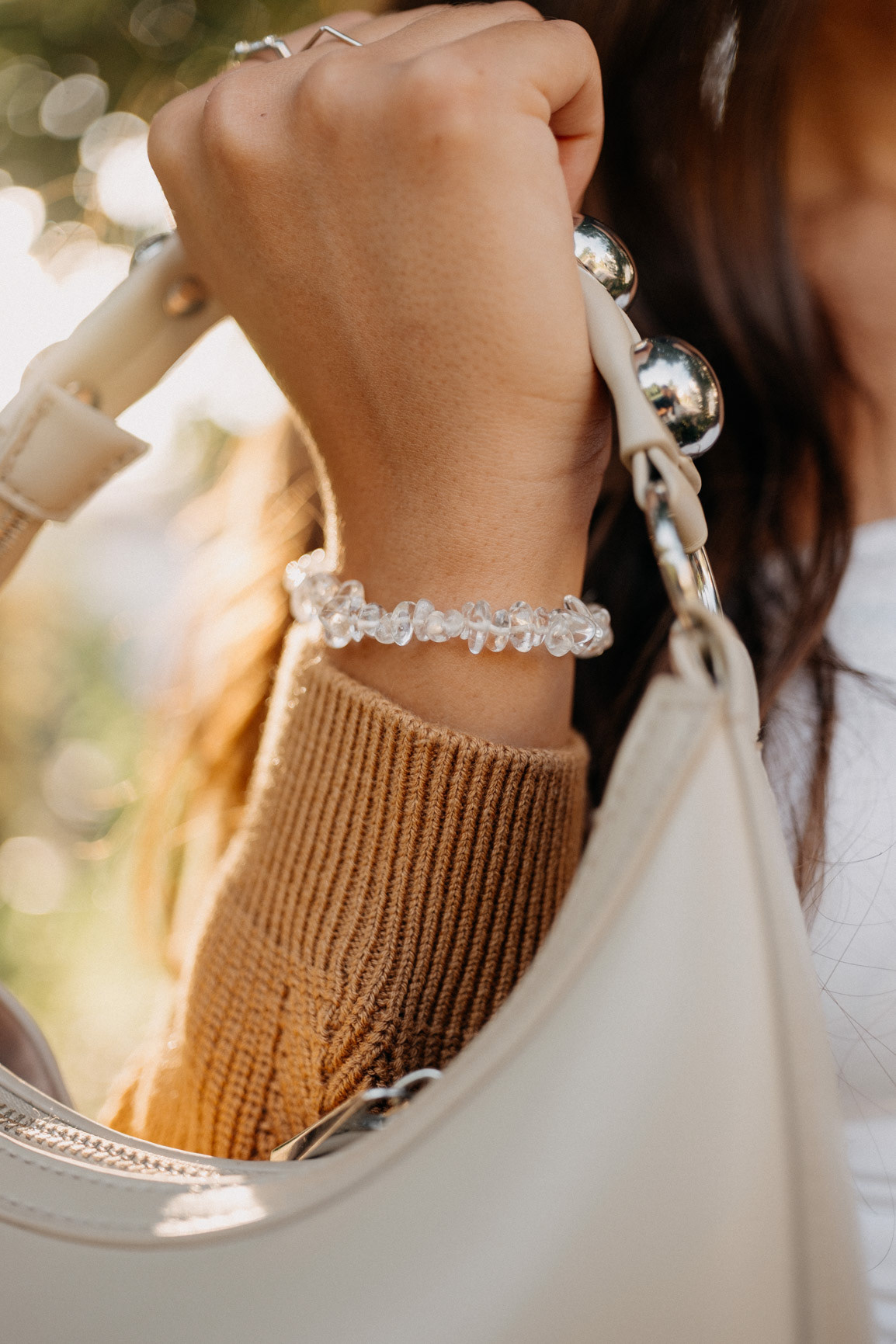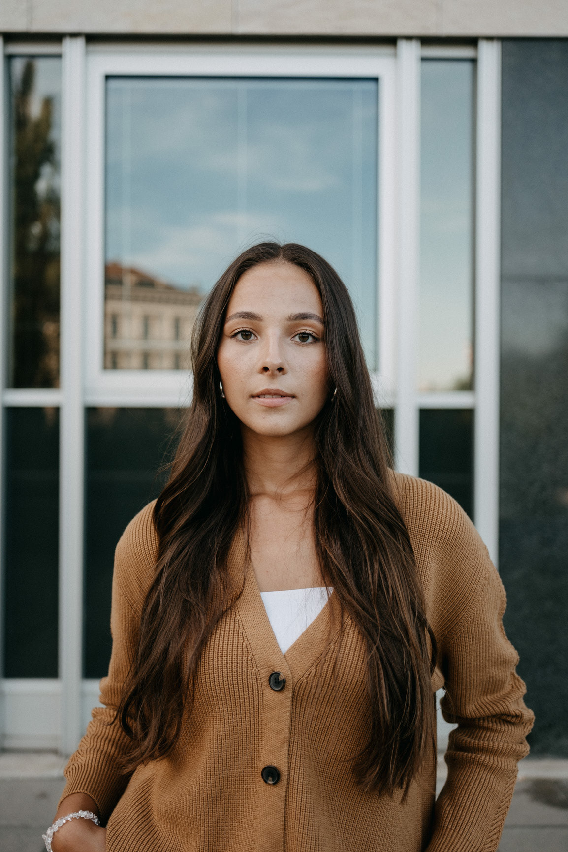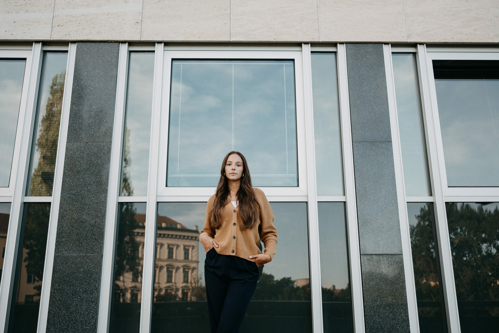 Teplý karamelový svetr, studené sklo za zády, jemný náramek, který zachytí světlo. Kontrast města a klidu. To všechno dohromady vytváří něco, co je pro mě podzim – rovnováha mezi energií a zastavením. 🍂