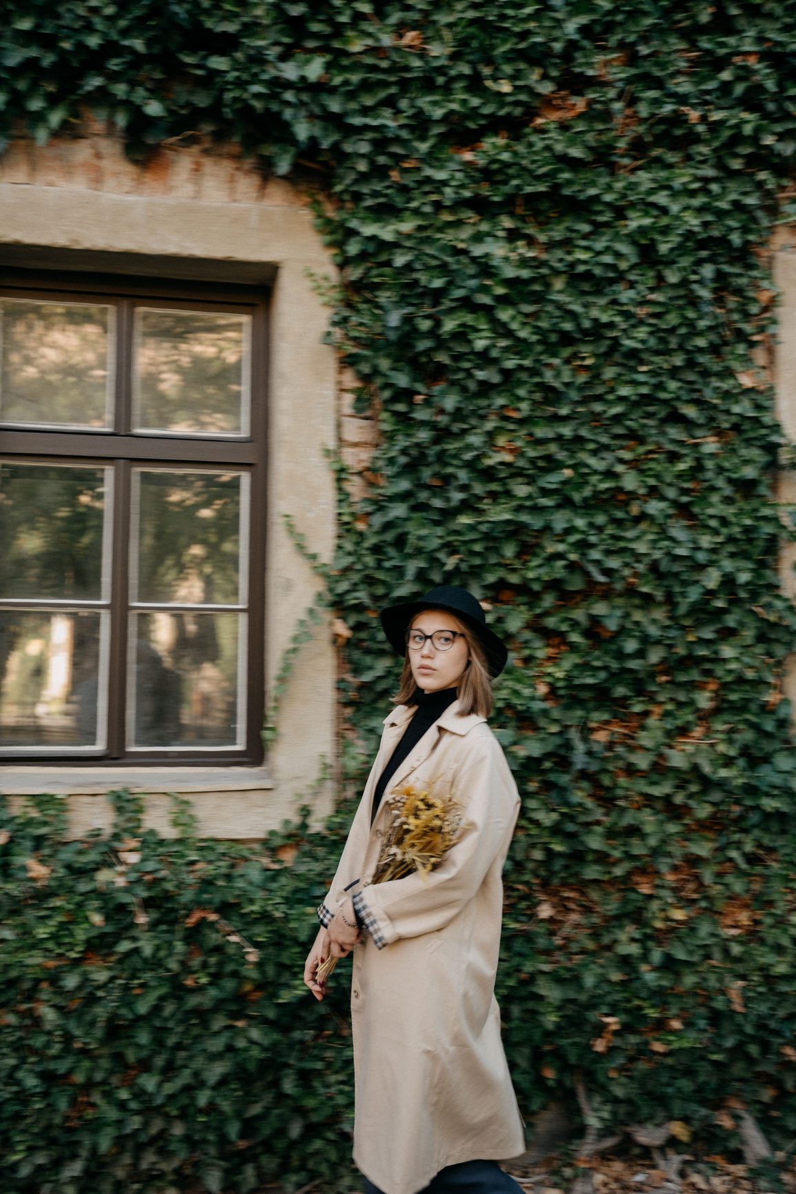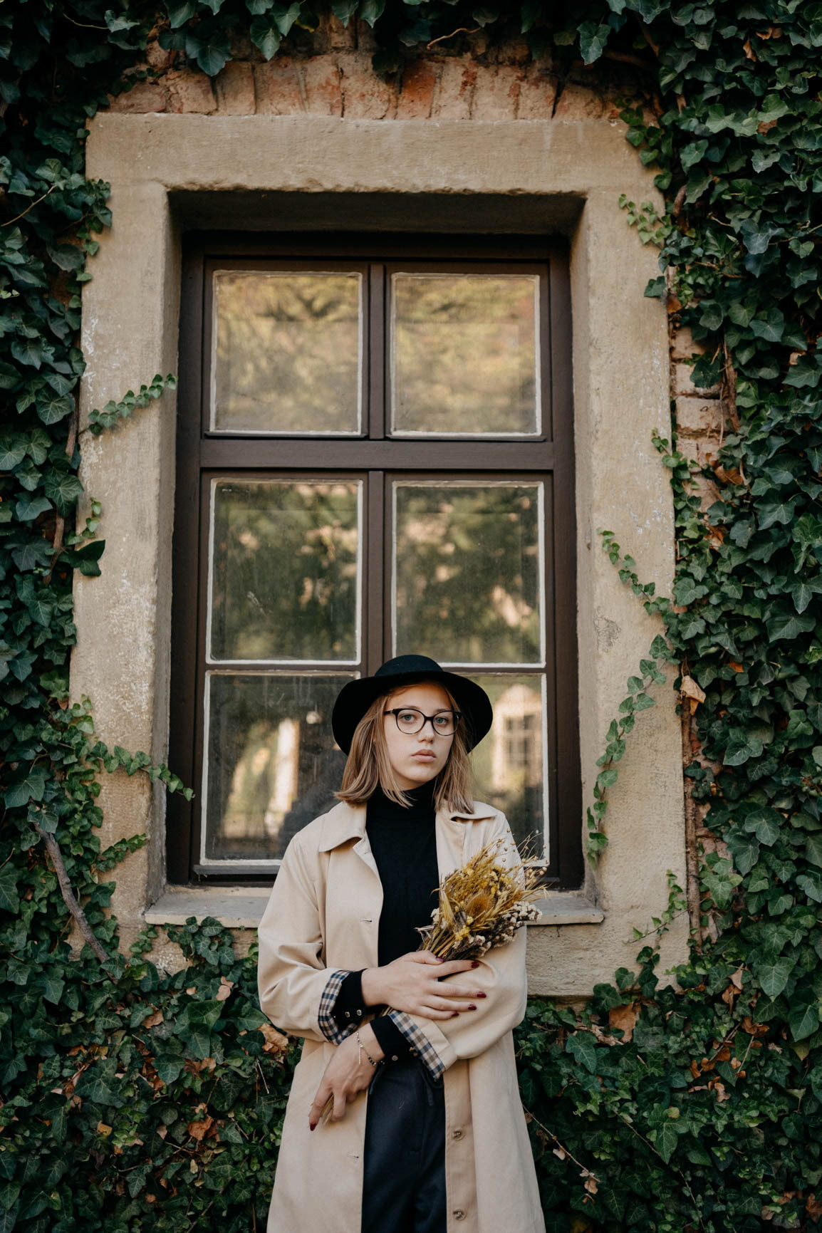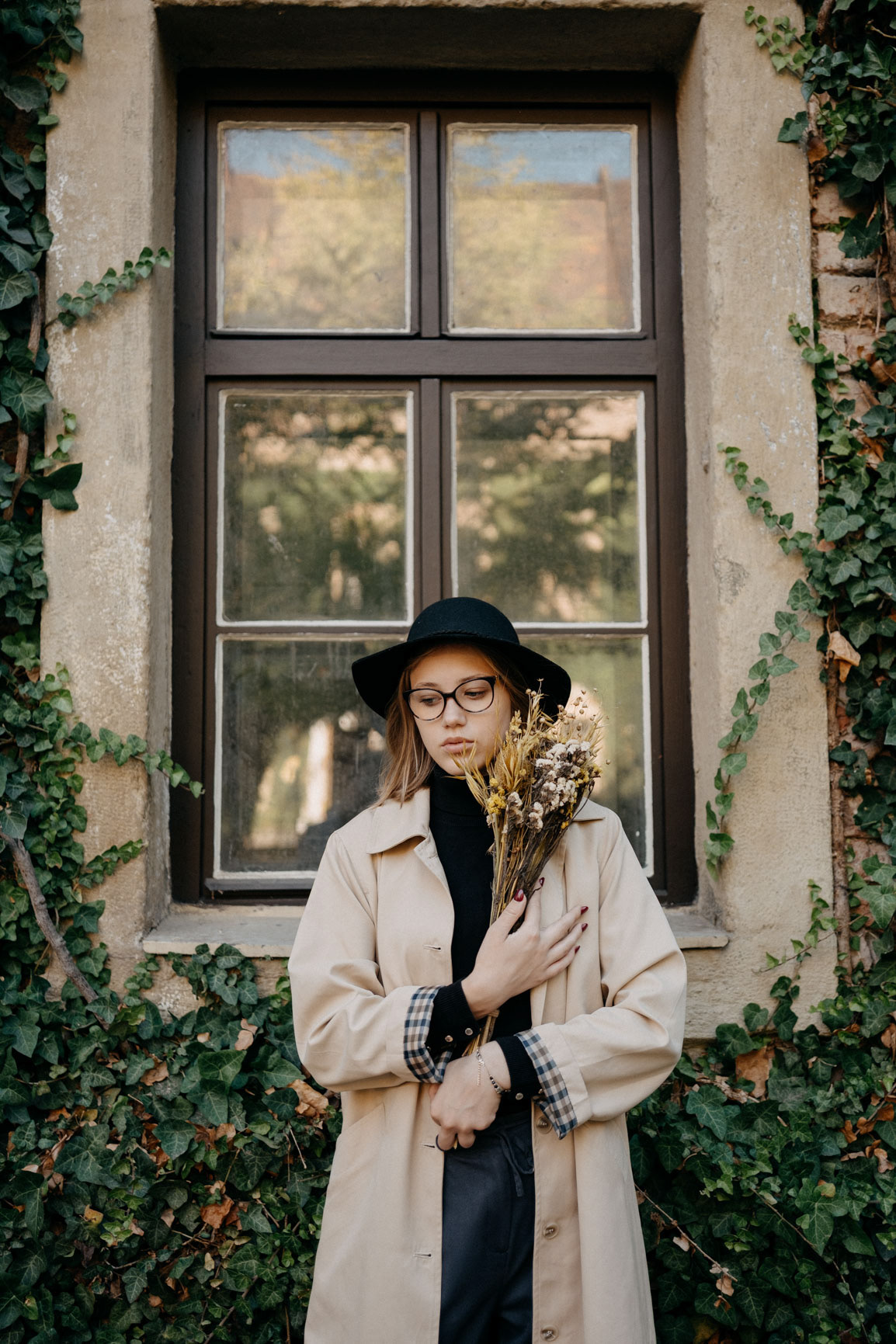 Modelka v béžovém kabátě a černém klobouku drží v rukou svazek usušených květin v odstínech hnědé a žluté, což krásně kontrastuje se zelení za jejími zády. Celý outfit působí elegantně, ale i lehce podzimně, a kytice doplňuje vizuální celek jemností a křehkostí.