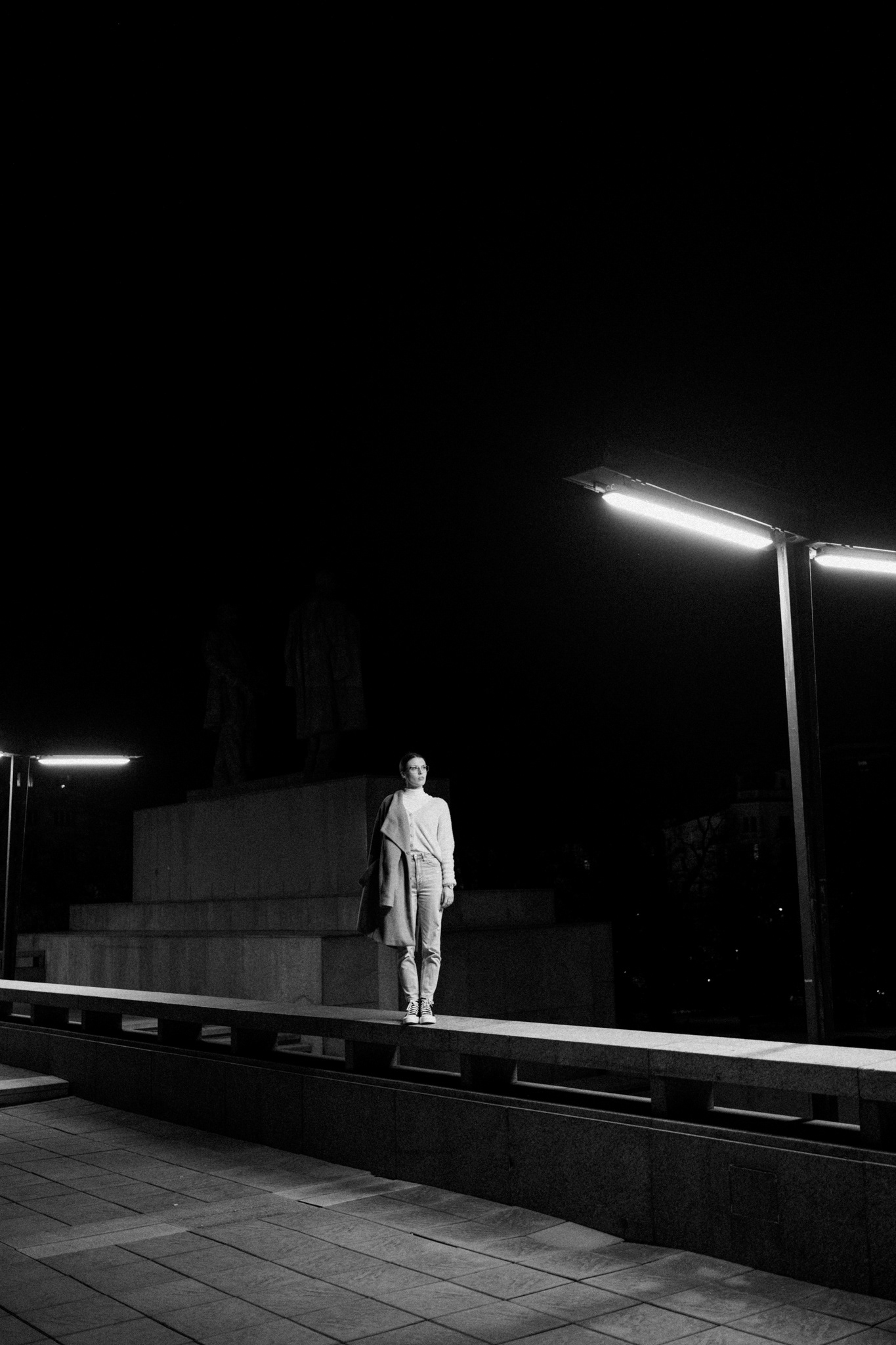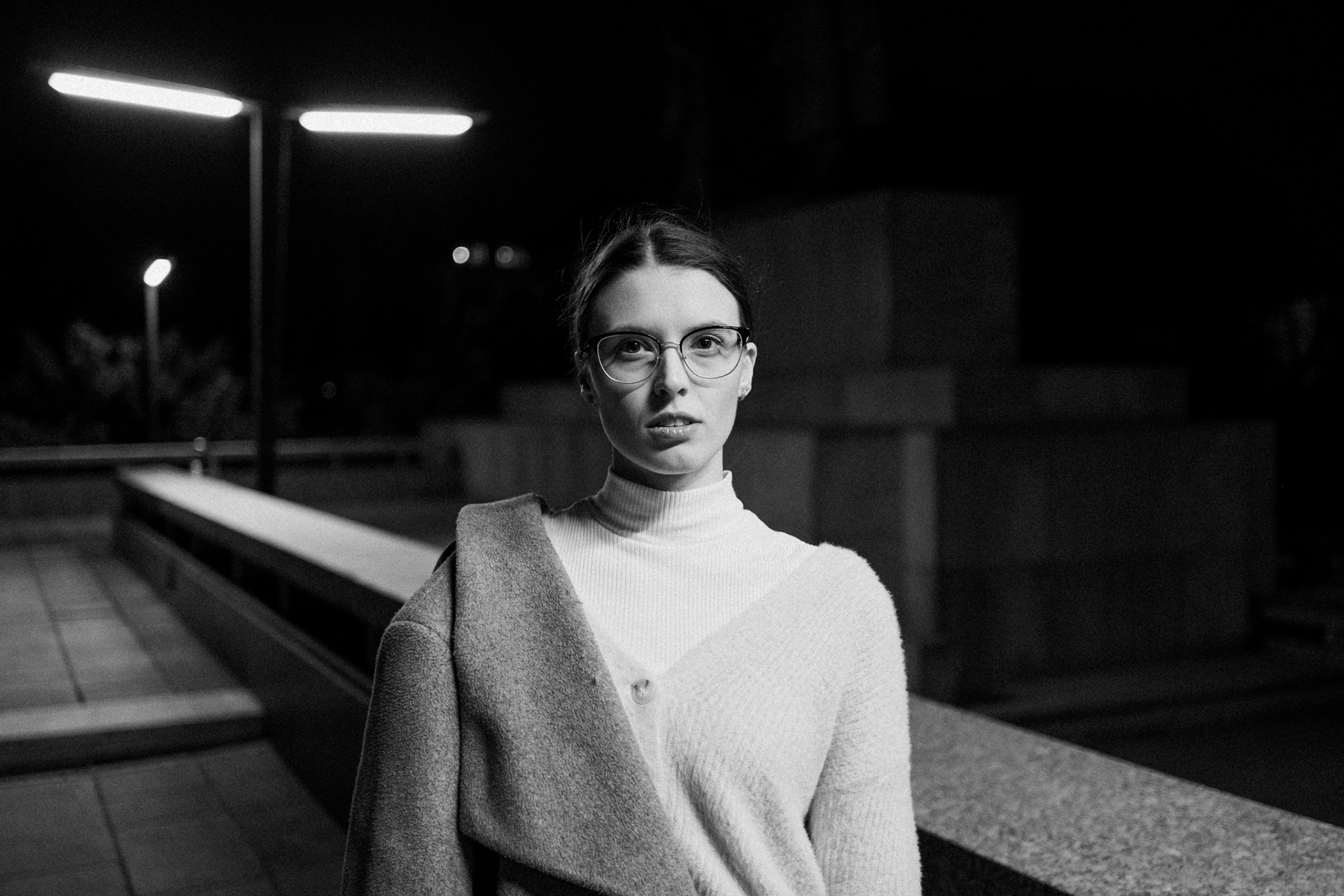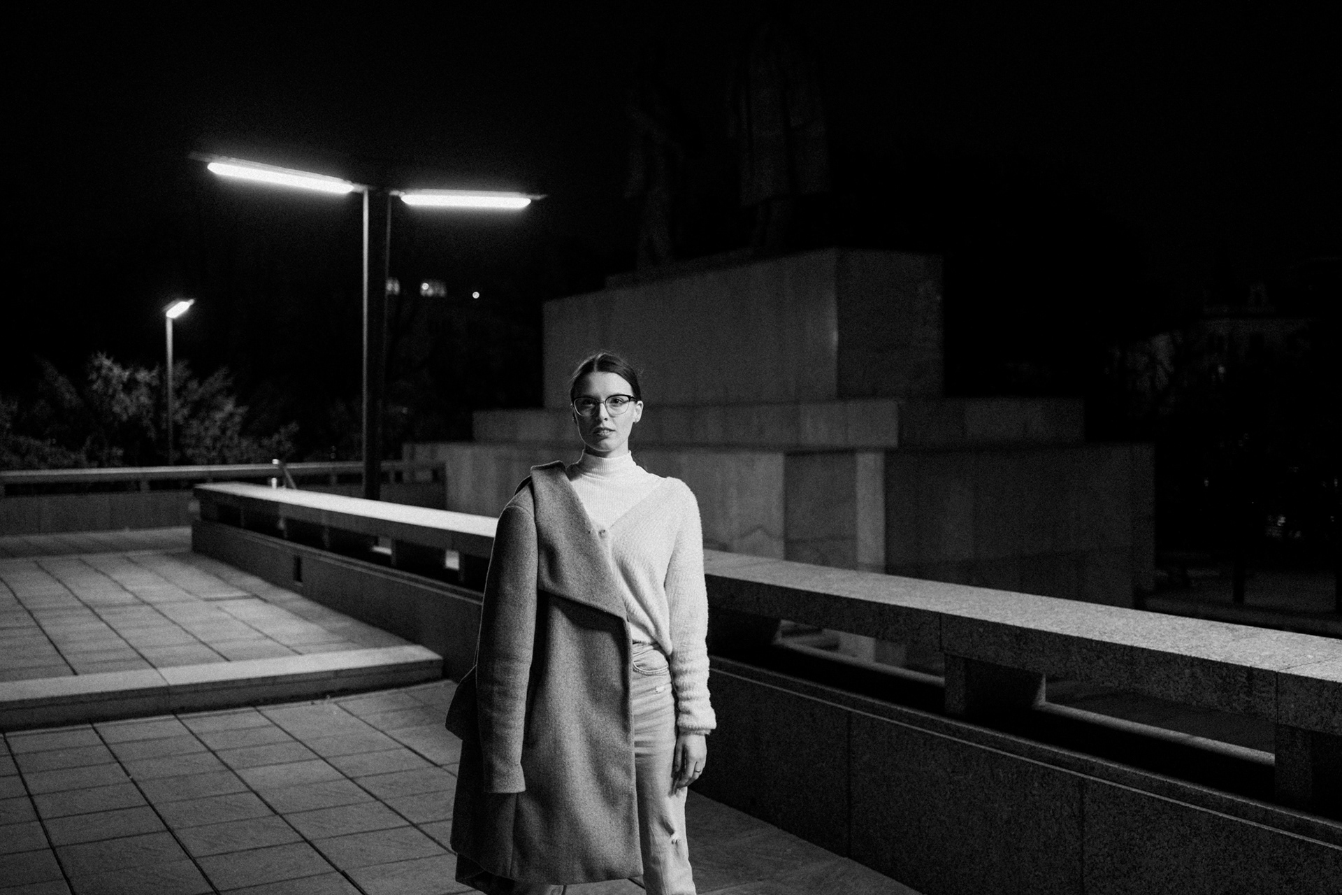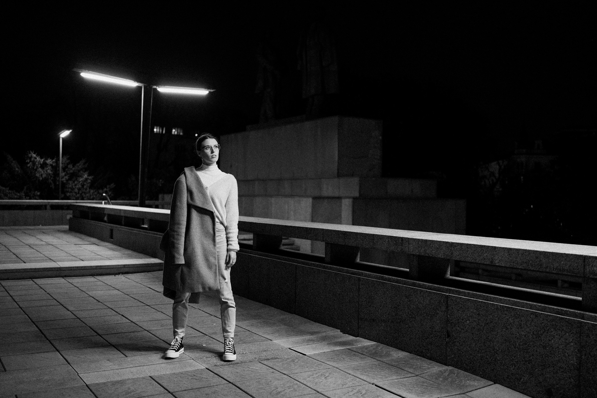 Černobílá série fotografií zachycuje tichou eleganci městské noci. V hlavní roli stojí žena pohybující se v moderním, téměř strohém prostoru, kde beton, linie a světlo vytvářejí silnou vizuální atmosféru. Ostré pouliční lampy kreslí kontrasty, které dodávají scénám hloubku i jemné napětí.