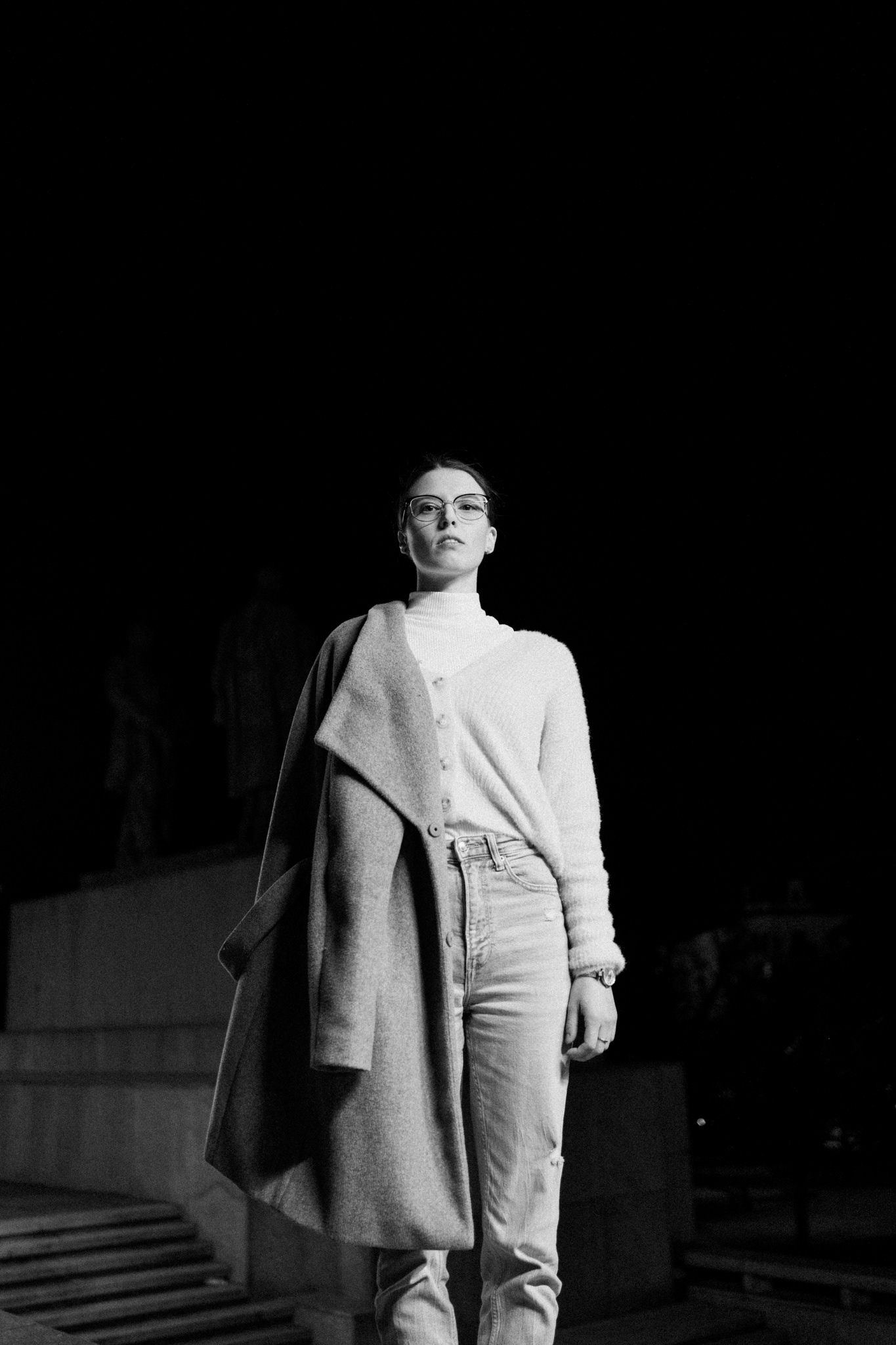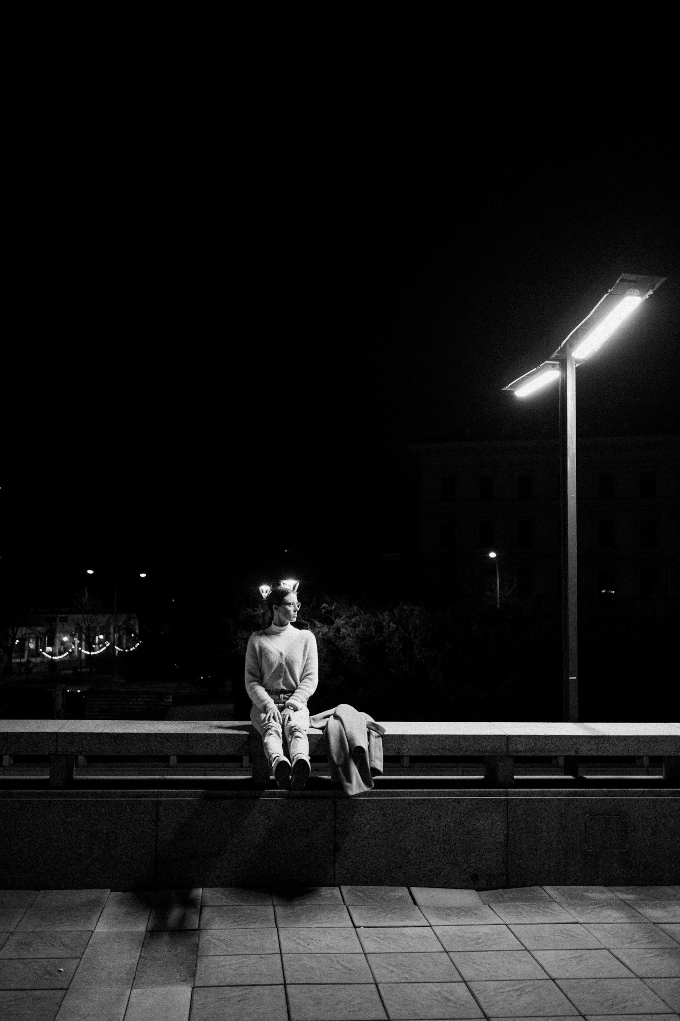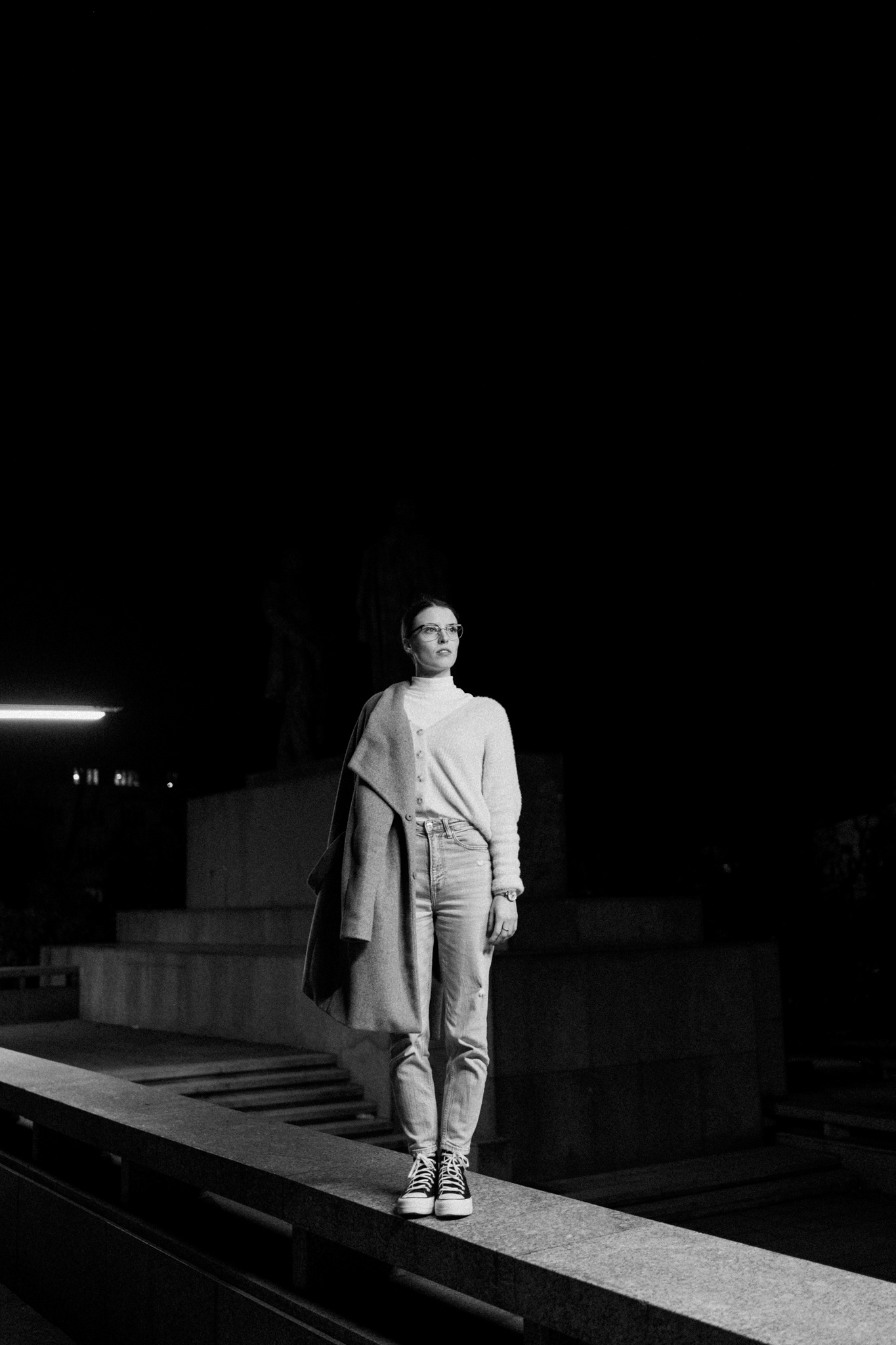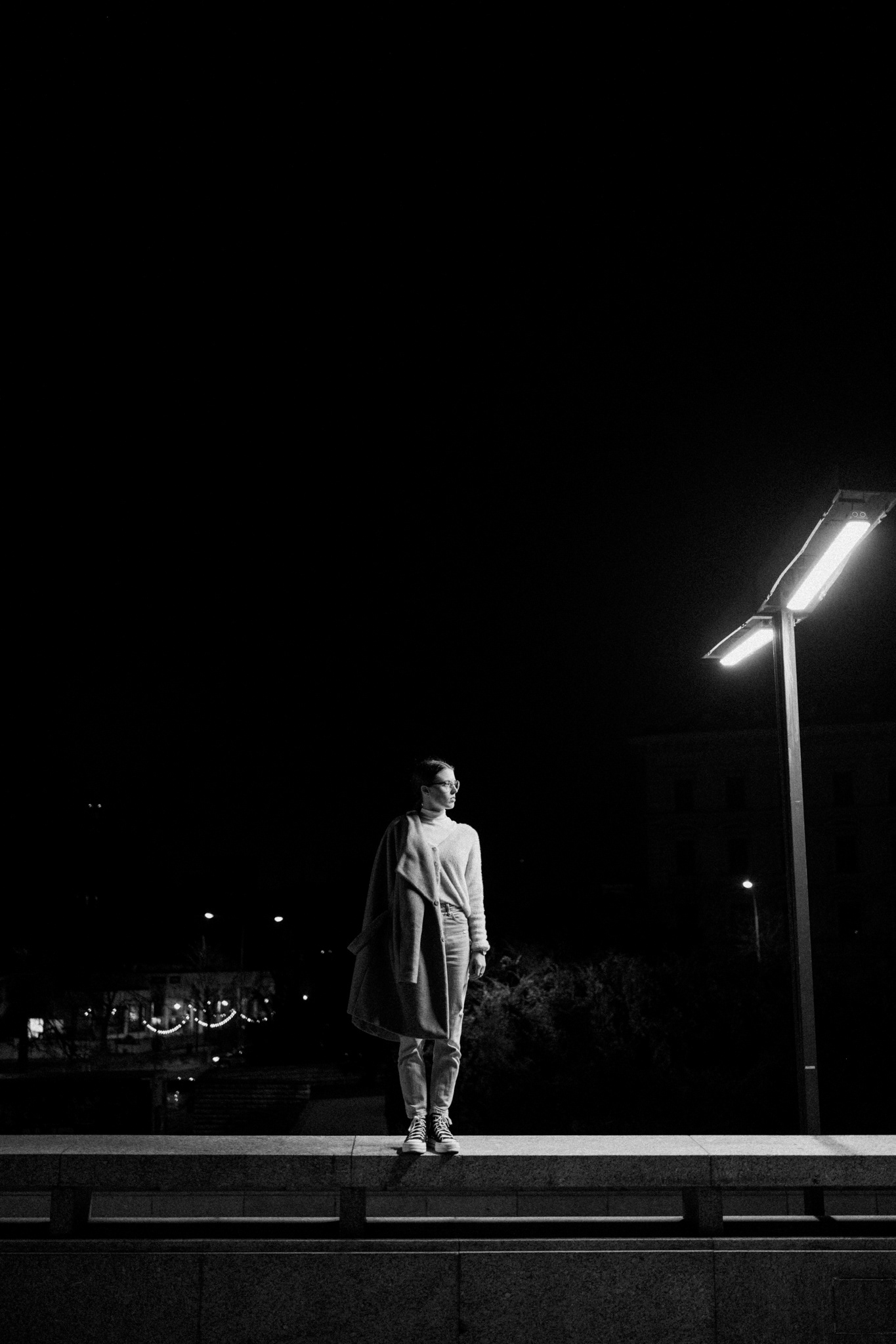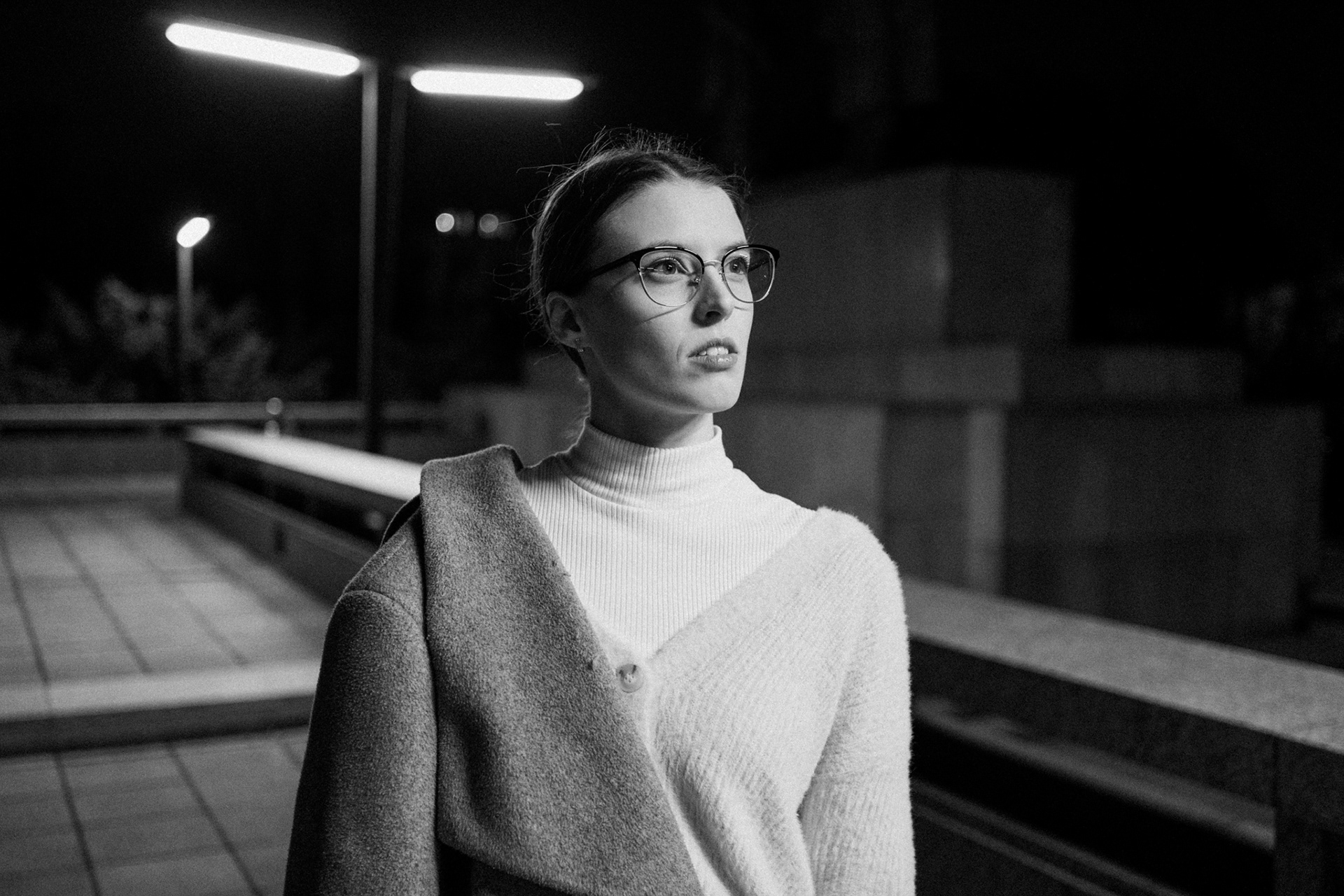 Černobílá série fotografií zachycuje tichou eleganci městské noci. V hlavní roli stojí žena pohybující se v moderním, téměř strohém prostoru, kde beton, linie a světlo vytvářejí silnou vizuální atmosféru. Ostré pouliční lampy kreslí kontrasty, které dodávají scénám hloubku i jemné napětí.