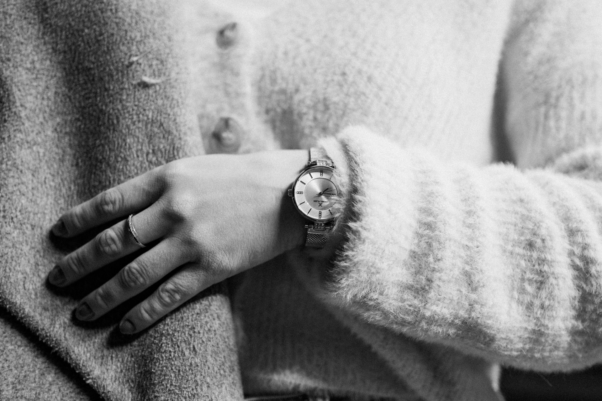Detailní záběry hodinek přinášejí do série nový rozměr. Nejde jen o doplněk, ale o symbol času plynoucího v kontrastu s klidnou, téměř zastavenou atmosférou nočních scén. Kombinace kovu, jemných odlesků a struktury látek podtrhuje cit pro detail i celkovou vizuální harmonii.