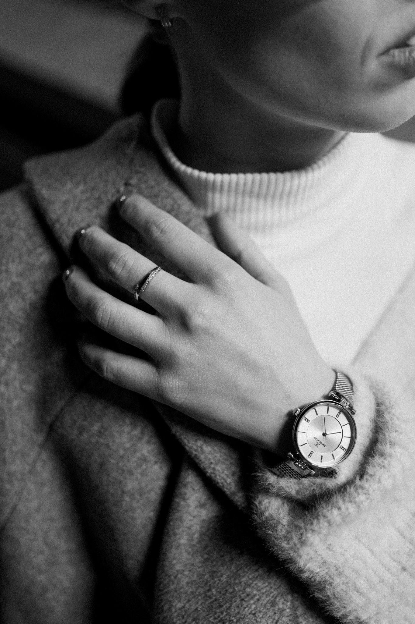 Styl modelky je jednoduchý, ale promyšlený – světlý rolák, kabát ležérně přehozený přes ramena a decentní doplňky. Právě detaily hrají klíčovou roli. Jemné prsteny a elegantní hodinky se stávají přirozenou součástí celku, aniž by narušovaly minimalistickou estetiku.